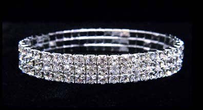 Three row stretch rhinestone bracelets. They are 3/8" wide. Currently in stock. Silver plated and individually poly-bagged.