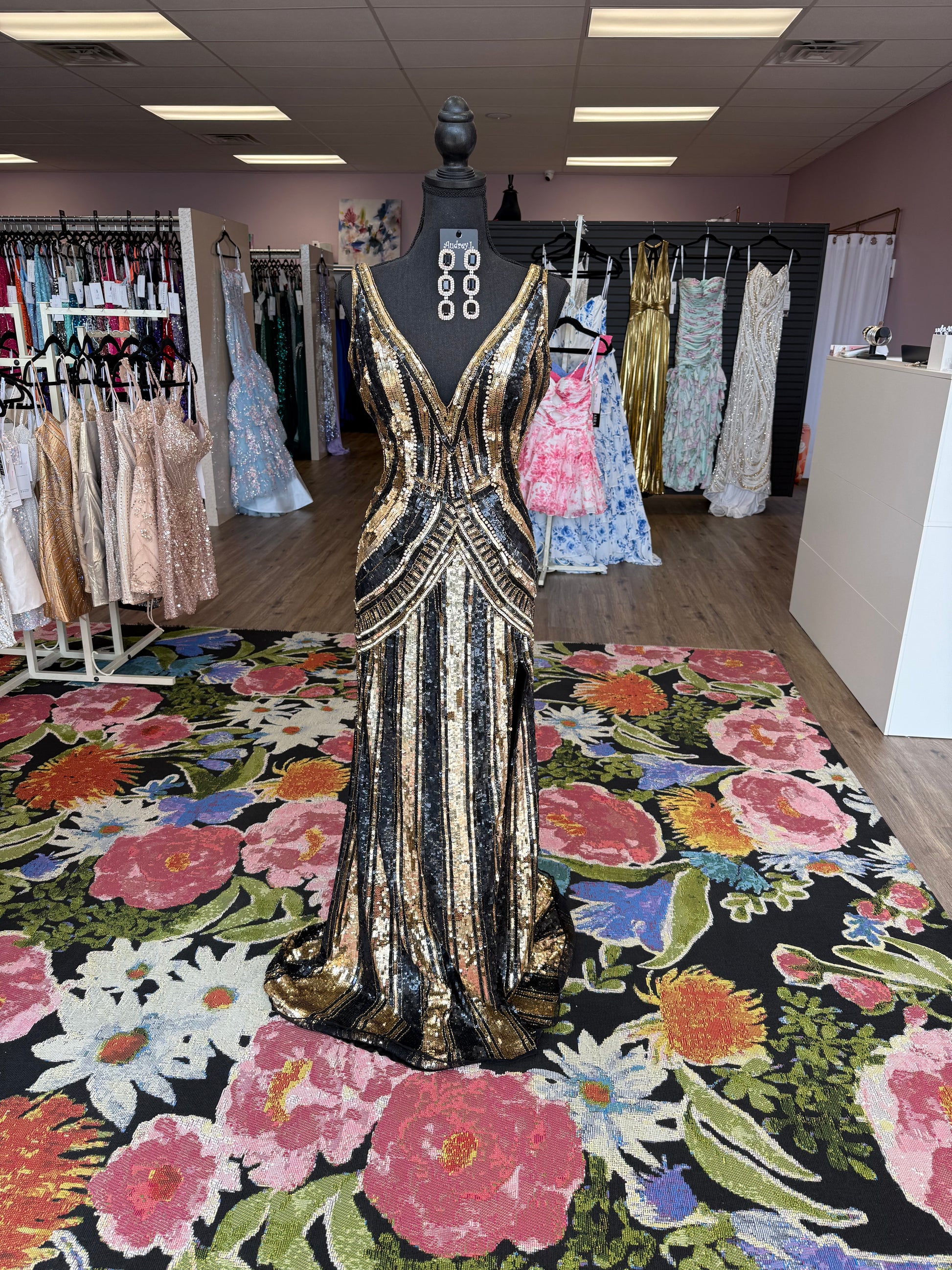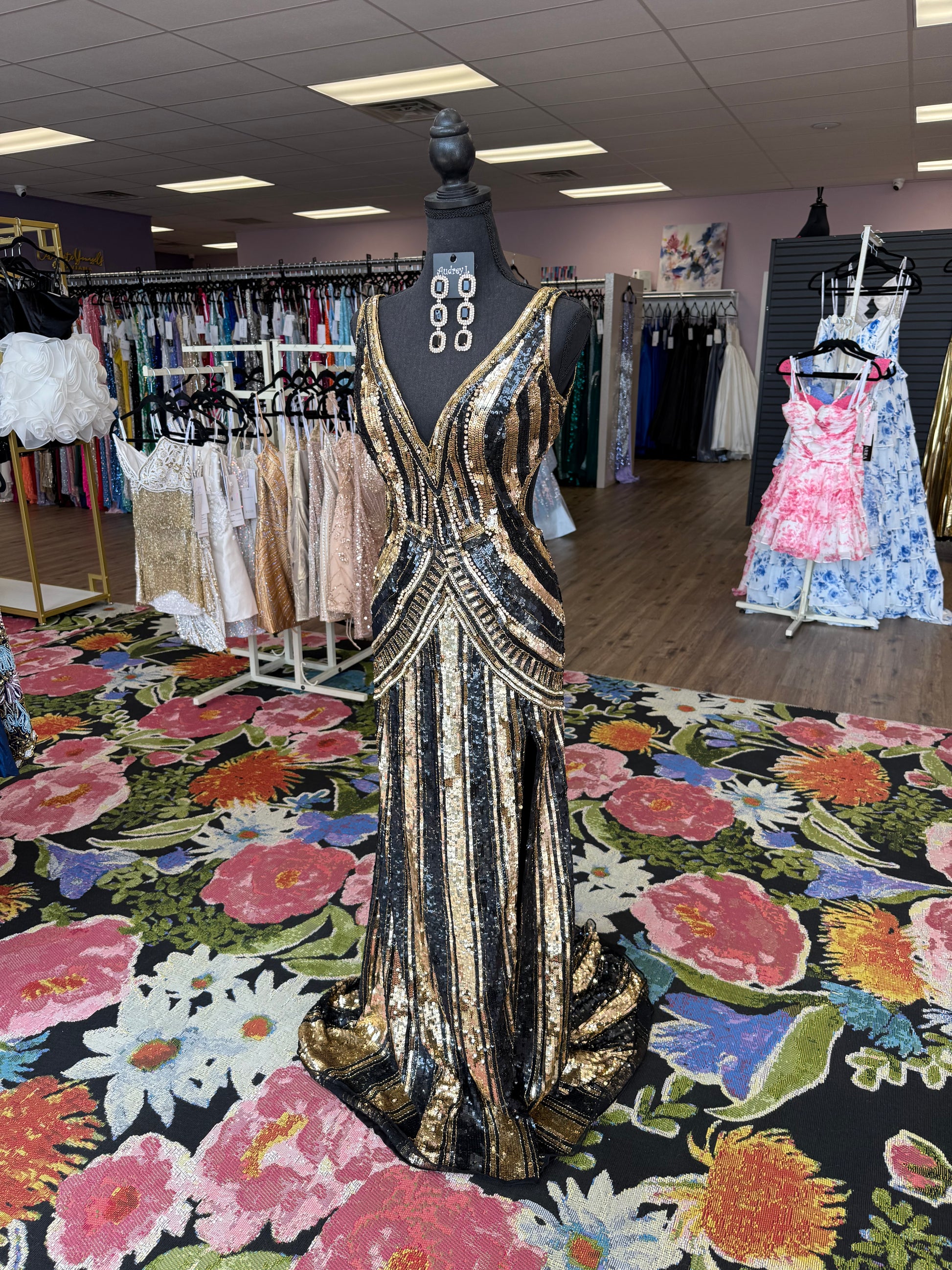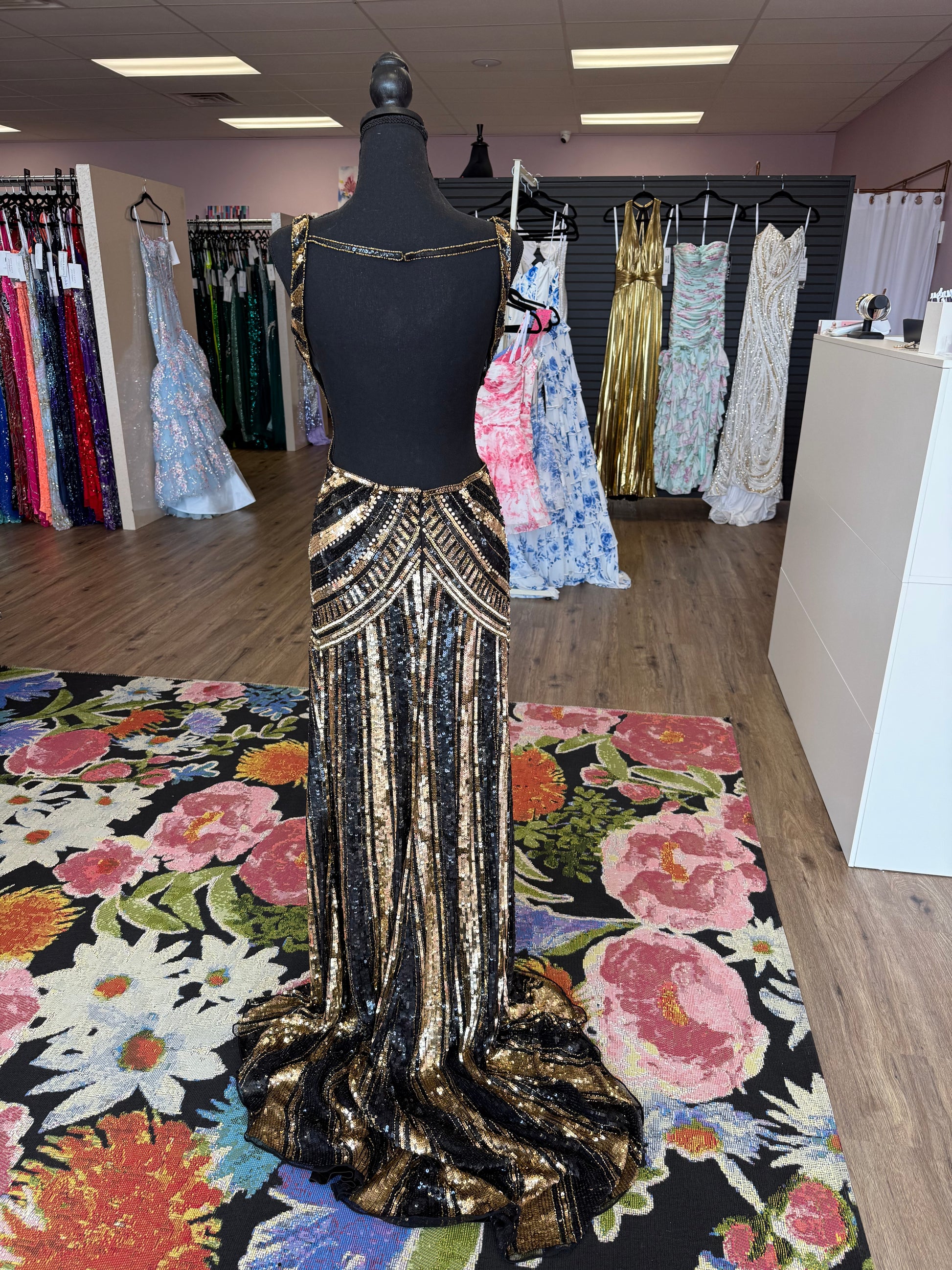This stunning black and gold sequin gown brings the perfect blend of glam and sophistication. Featuring a flattering fit with intricate bead detailing and a dramatic train, it’s perfect for any special occasion where you want to shine. Whether you're attending a gala or a formal event, this dress will definitely turn heads.