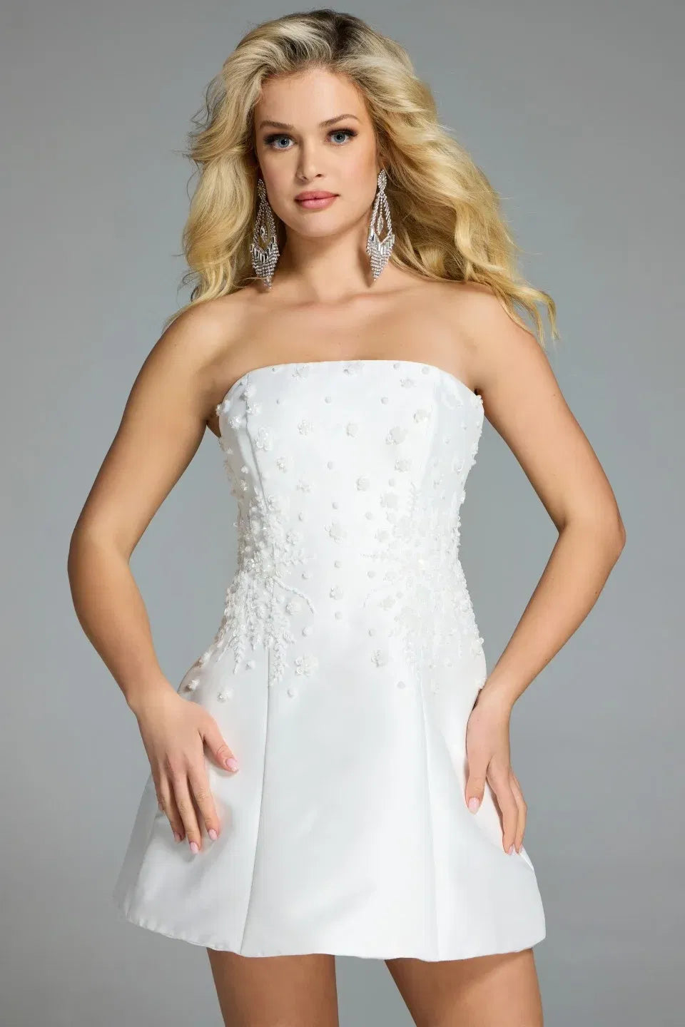 This strapless white homecoming dress features delicate flower-shaped bead detailing, adding subtle elegance to its clean silhouette. Its refined design offers a timeless and graceful look, perfect for making a sophisticated impression at your special event.