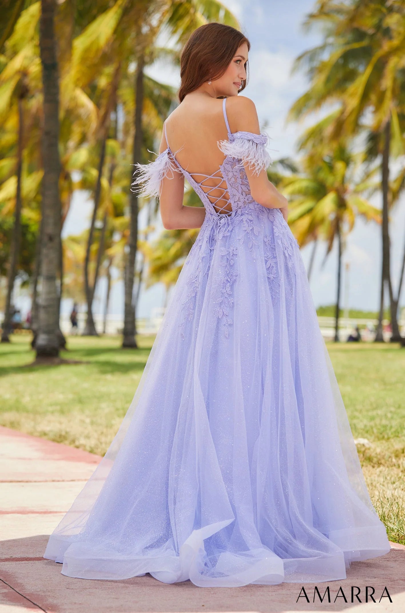The sheer top of the AMARRA 88537 is strikingly punctuated with a lace-up back, seamlessly blending intricate detailing with a modern twist. Its pockets serve as both a stylish and practical addition, allowing you to carry your essentials with ease throughout your special event. To further accentuate its allure, off-shoulder feathers can be effortlessly attached or detached, providing just the right touch of drama according to your preference.