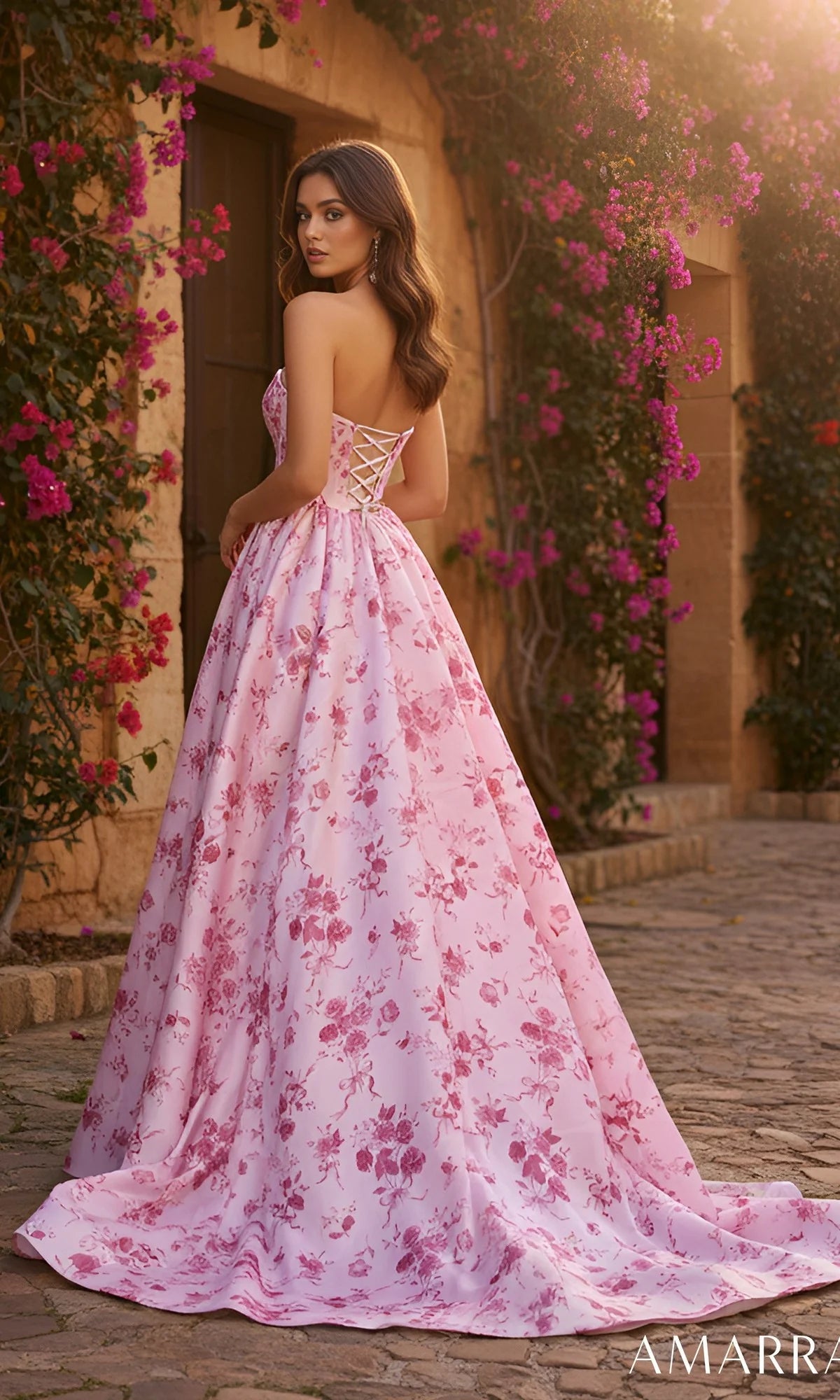 Strapless pink floral-printed prom dress by Amarra with a fitted corset bodice, a pleated bustline, and an adjustable lace-up open back. The dress transitions to a full-length draped a-line skirt with a high-leg slit and finishes in a beautiful sweep train for a breathtaking look.