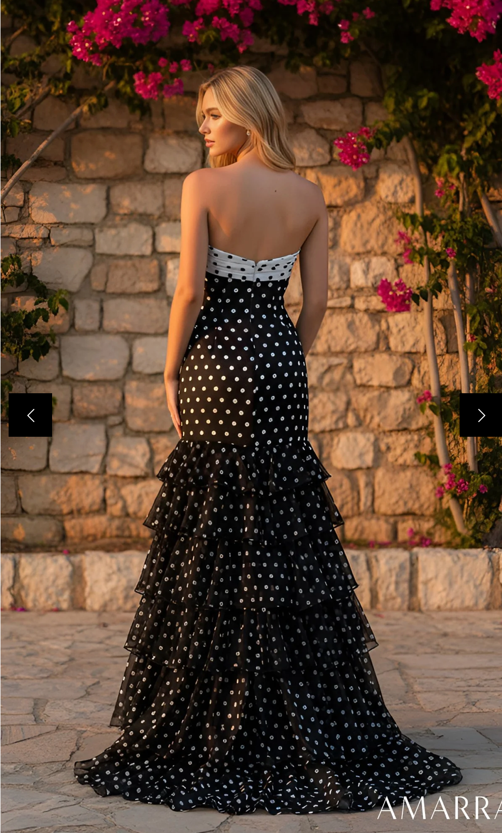 Strapless polka dot printed prom dress by Amarra featuring a ruched white top with a sweetheart neckline, a front keyhole cutout and a midrise open back with a zipper closure. The dress has a black fitted bodice, hugs the curves and then flows into a floor-length layered-chiffon skirt with a high-leg slit and sweep train.