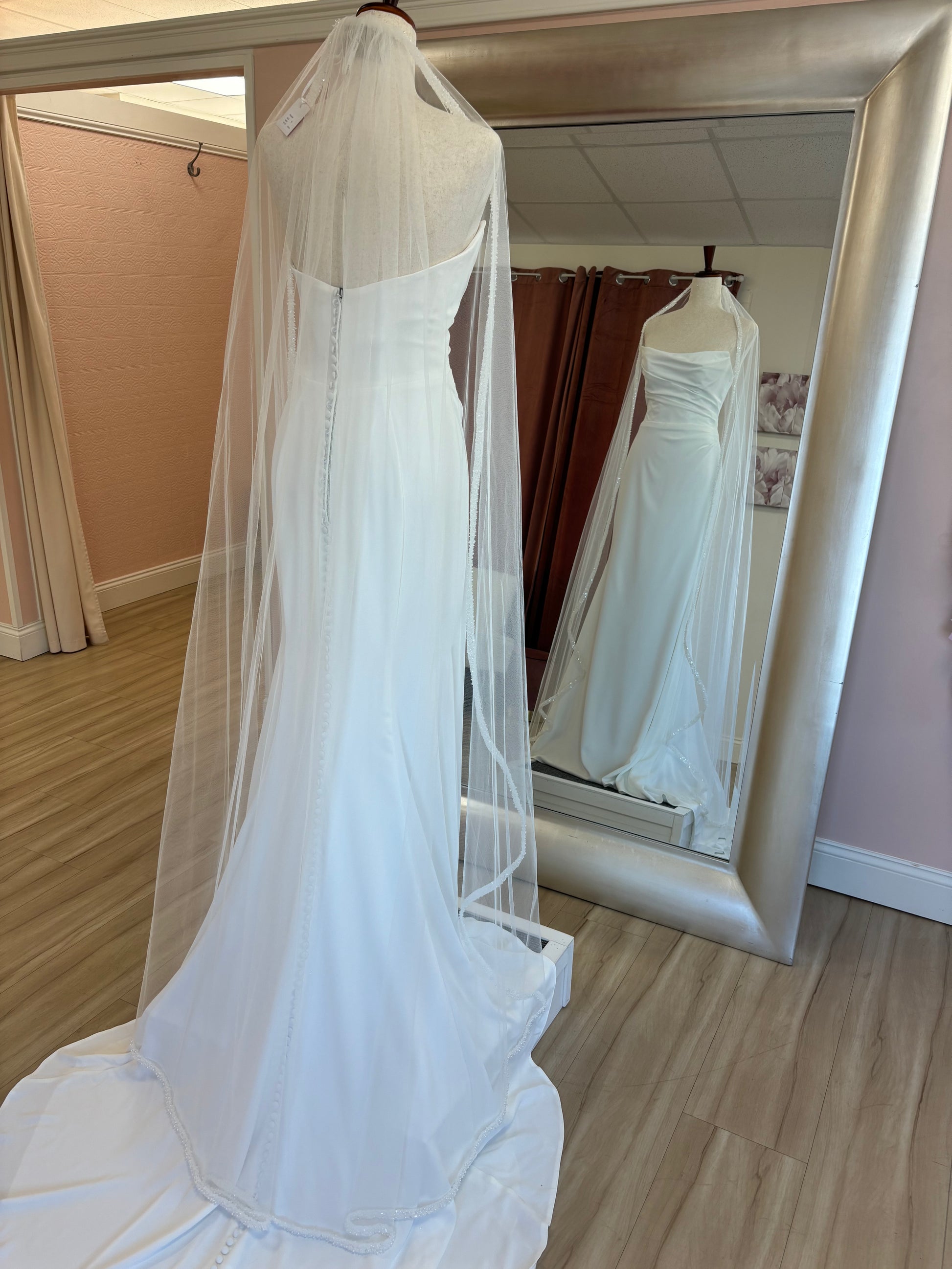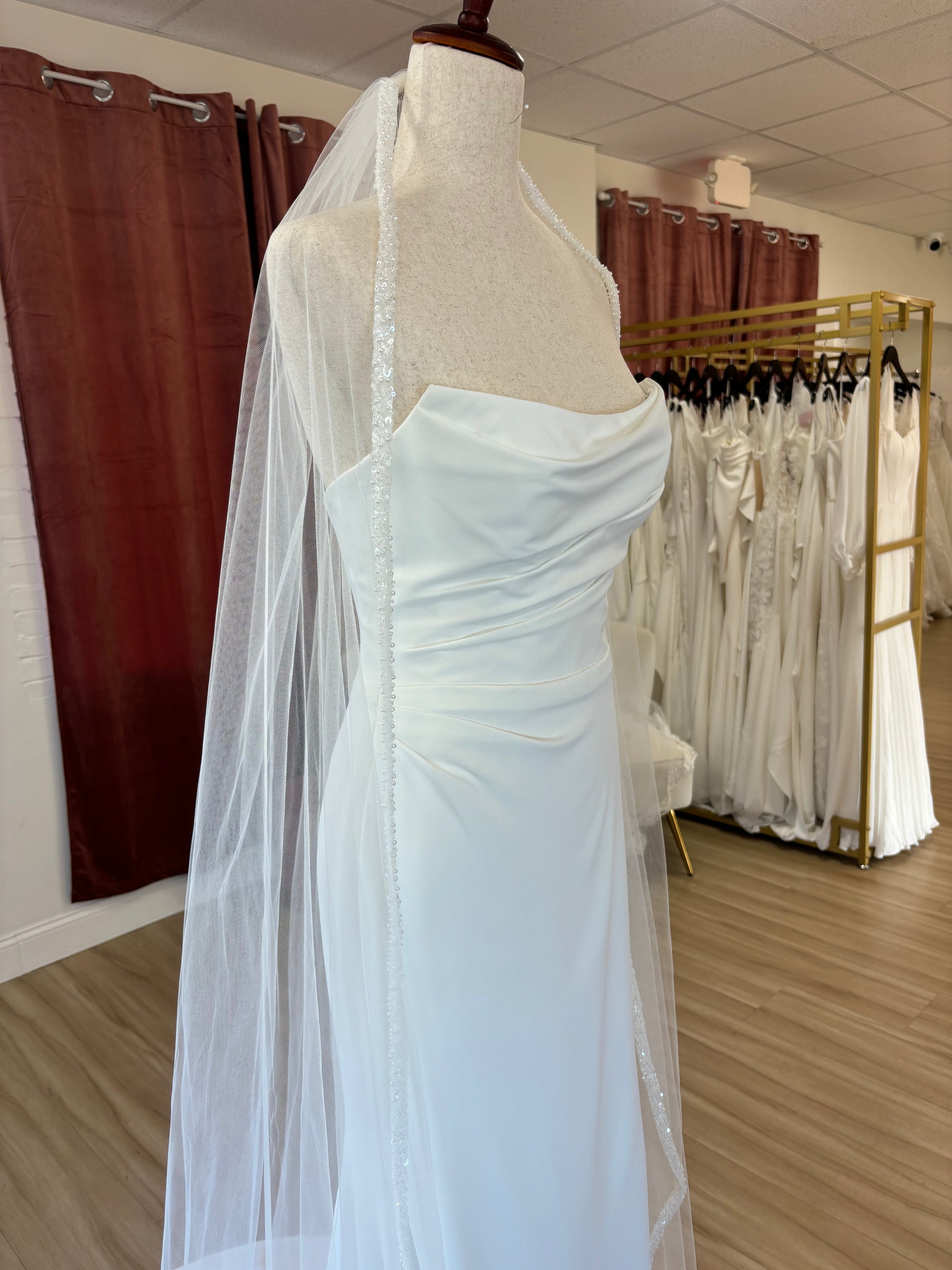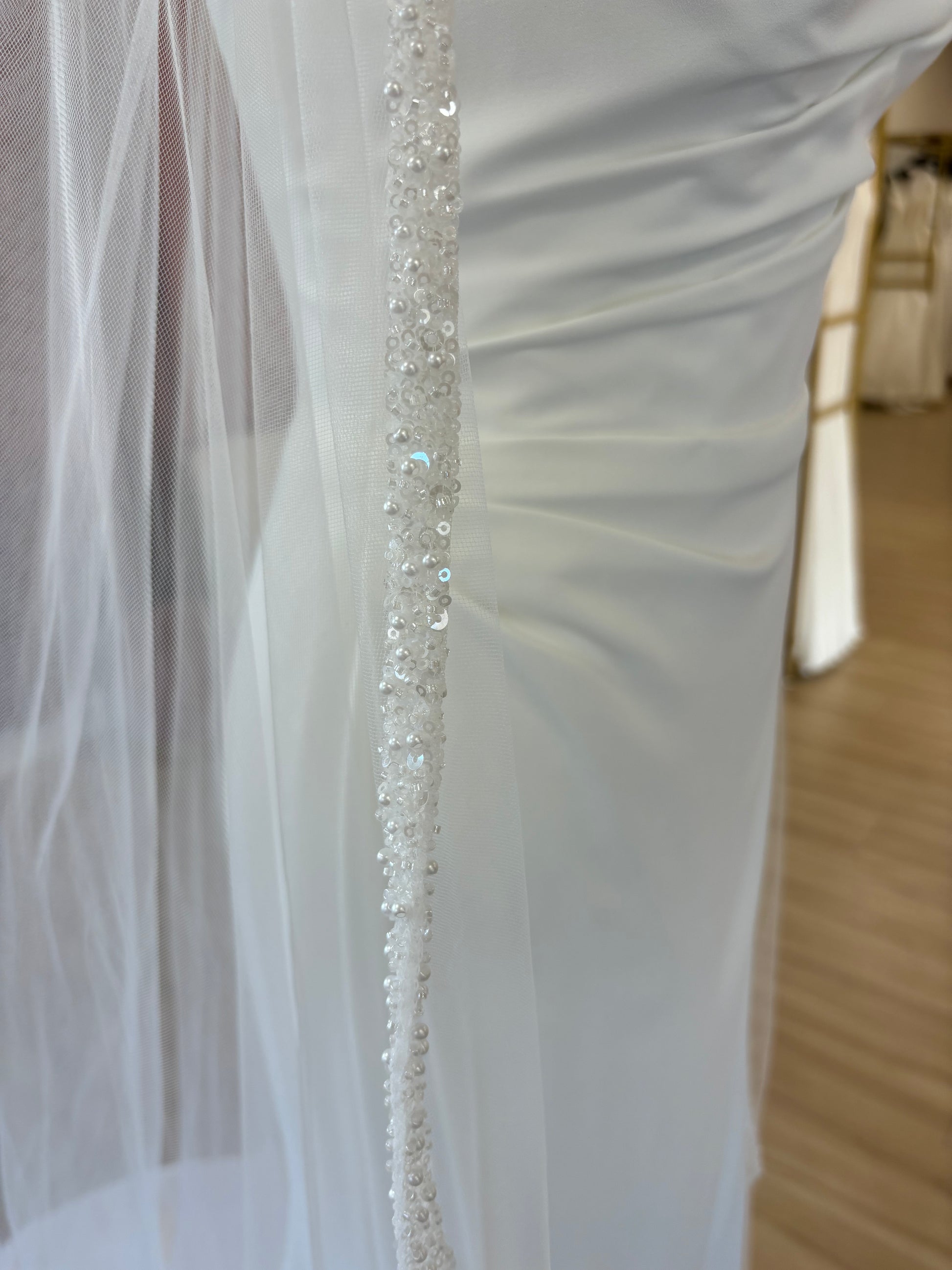 Waltz length tulle veil featuring a border of sequins, pearls, and beading