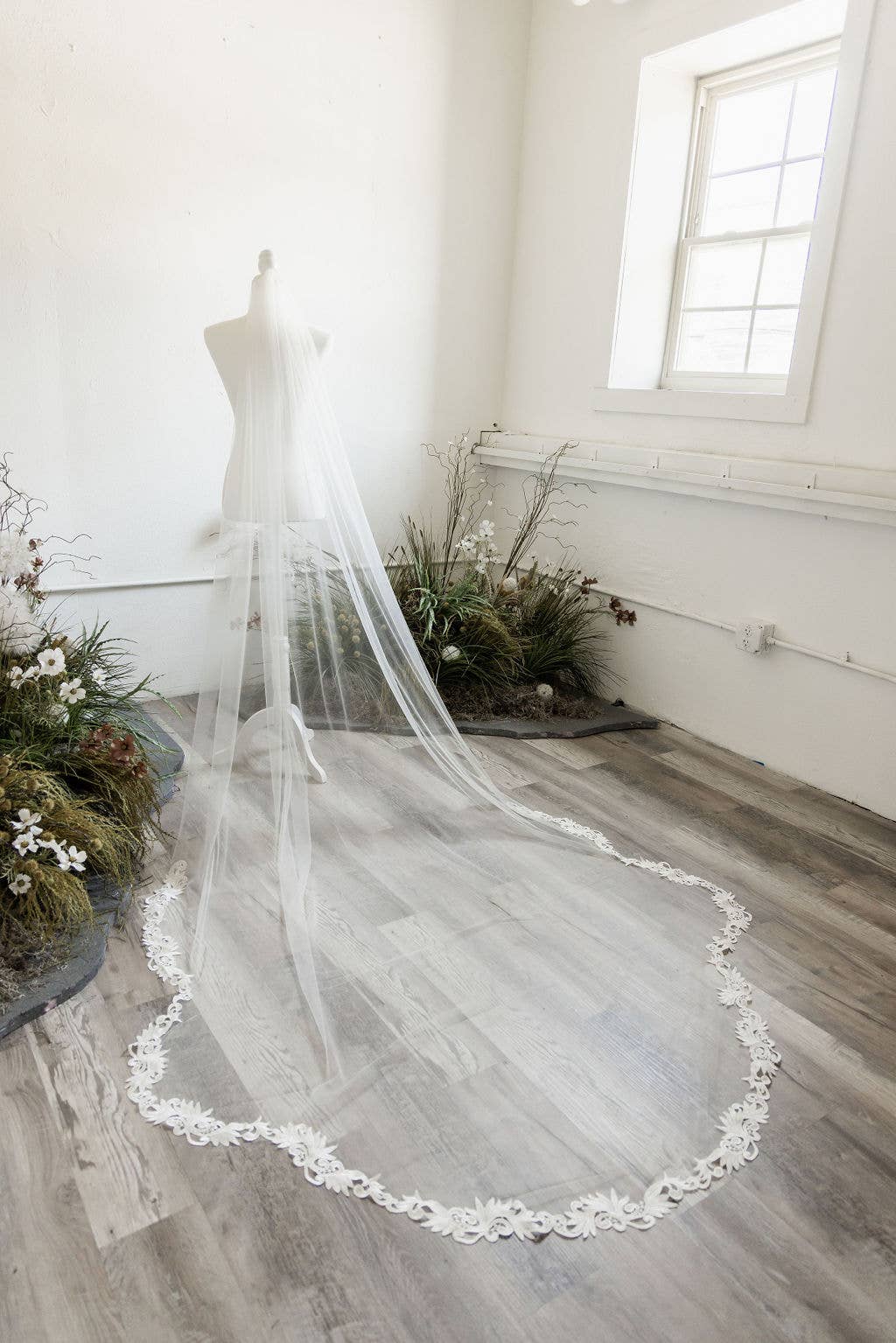 This Cathedral Length lace wedding veil measures 120.0" long and approximately 40" long at its widest point. The lace trim begins approximately 80" from the veils' metal comb.