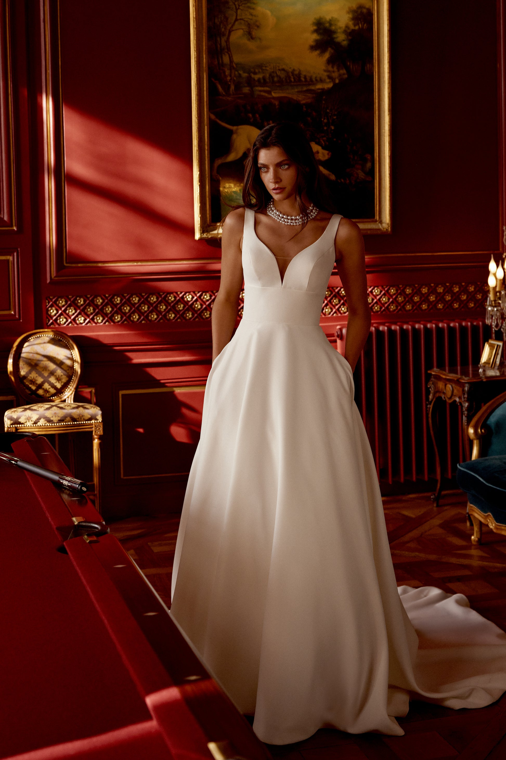 Satin a-line gown with plunging v-neckline
