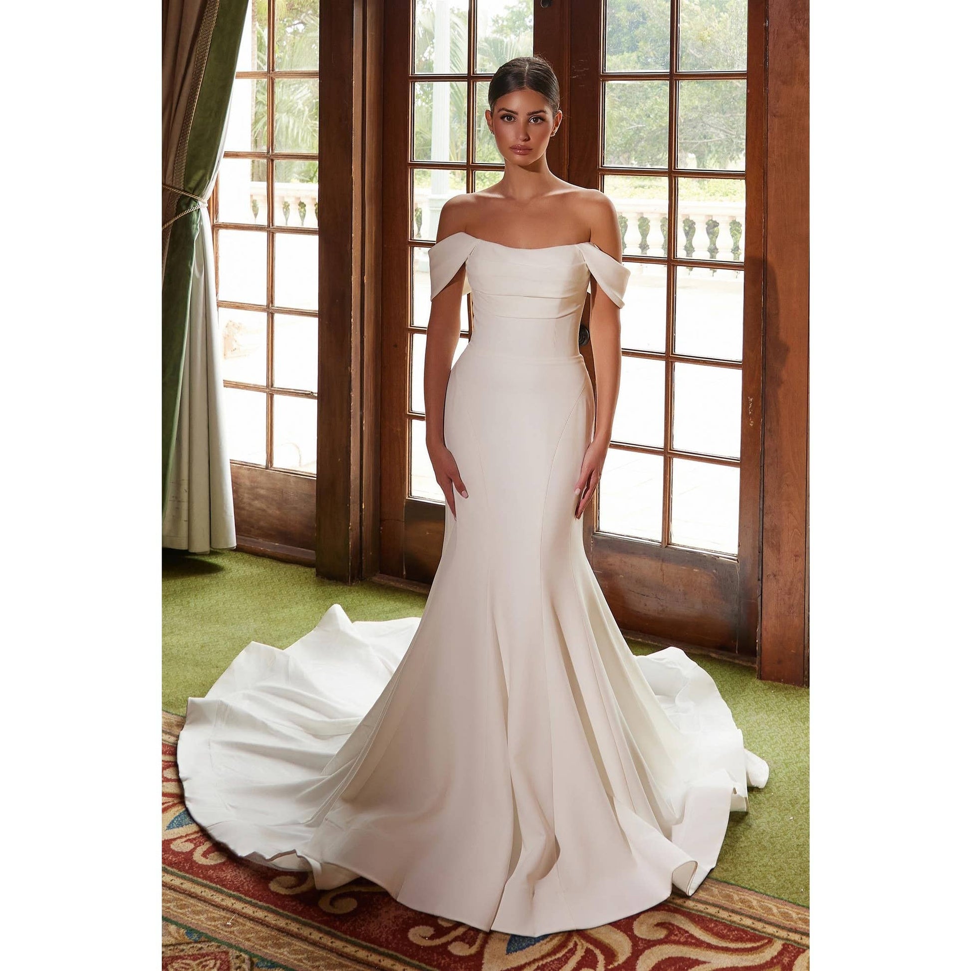 This elegant, stretch satin, minimalist wedding dress exudes timeless sophistication. The bodice features a straight, strapless neckline that beautifully frames the face. The bust area is accentuated with delicate pleating, adding subtle texture and definition to the silhouette. Elegant, off-the-shoulder straps gracefully frame the décolletage, creating a romantic, modern look. The back of the dress showcases a discrete zipper closure, maintaining the clean, streamlined aesthetic.