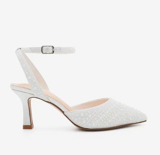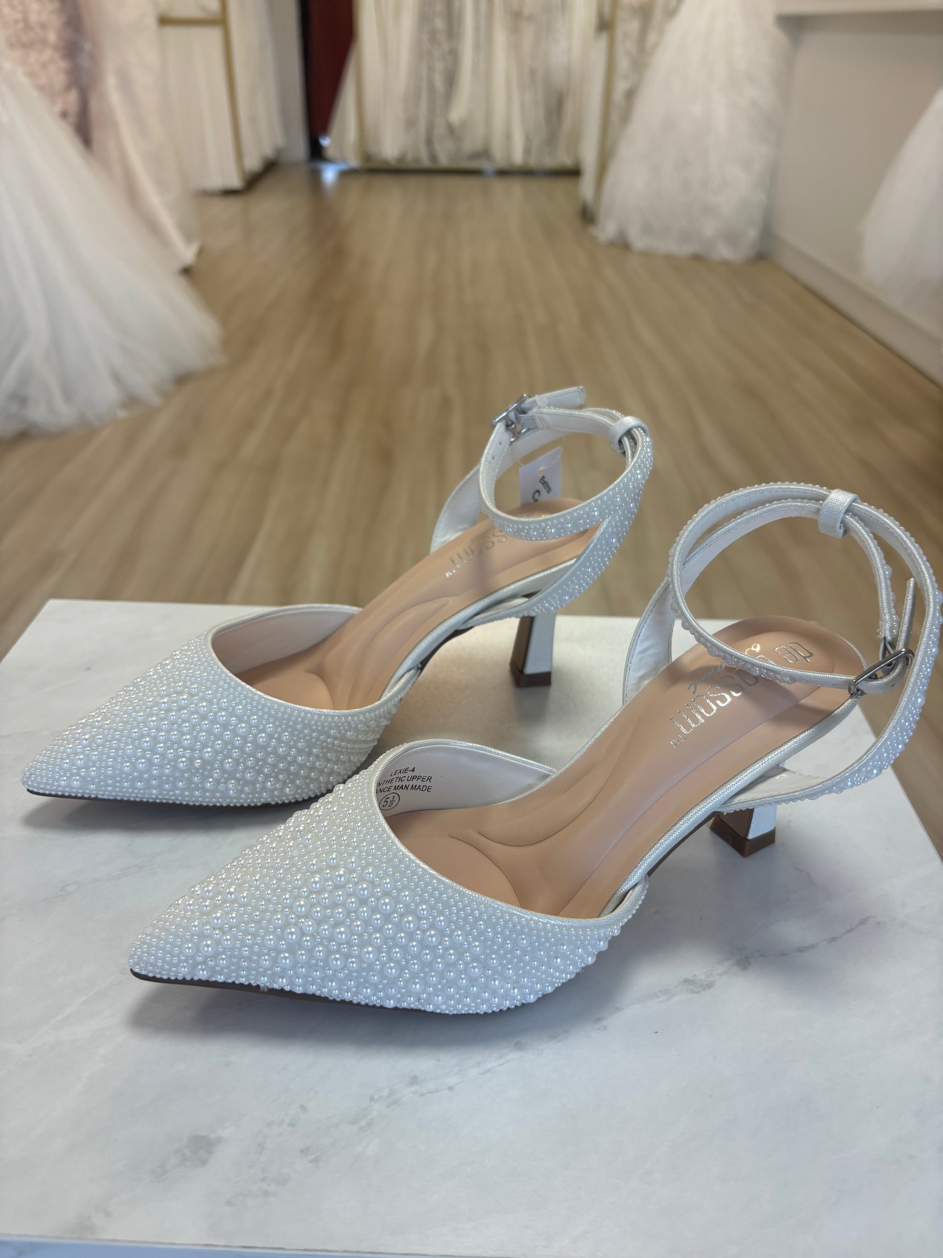 Closed toed, white heels accented fully with pearls, with an adjustable ankle straps and a 3 inch heel