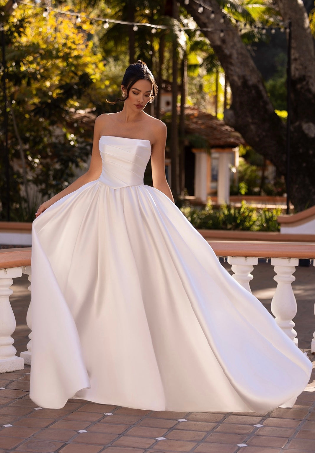 Mikado, A-line gown featuring a strapless, straight neckline, ruching on the bodice, basque waist, and pleating where the bodice and flowing skirt meet