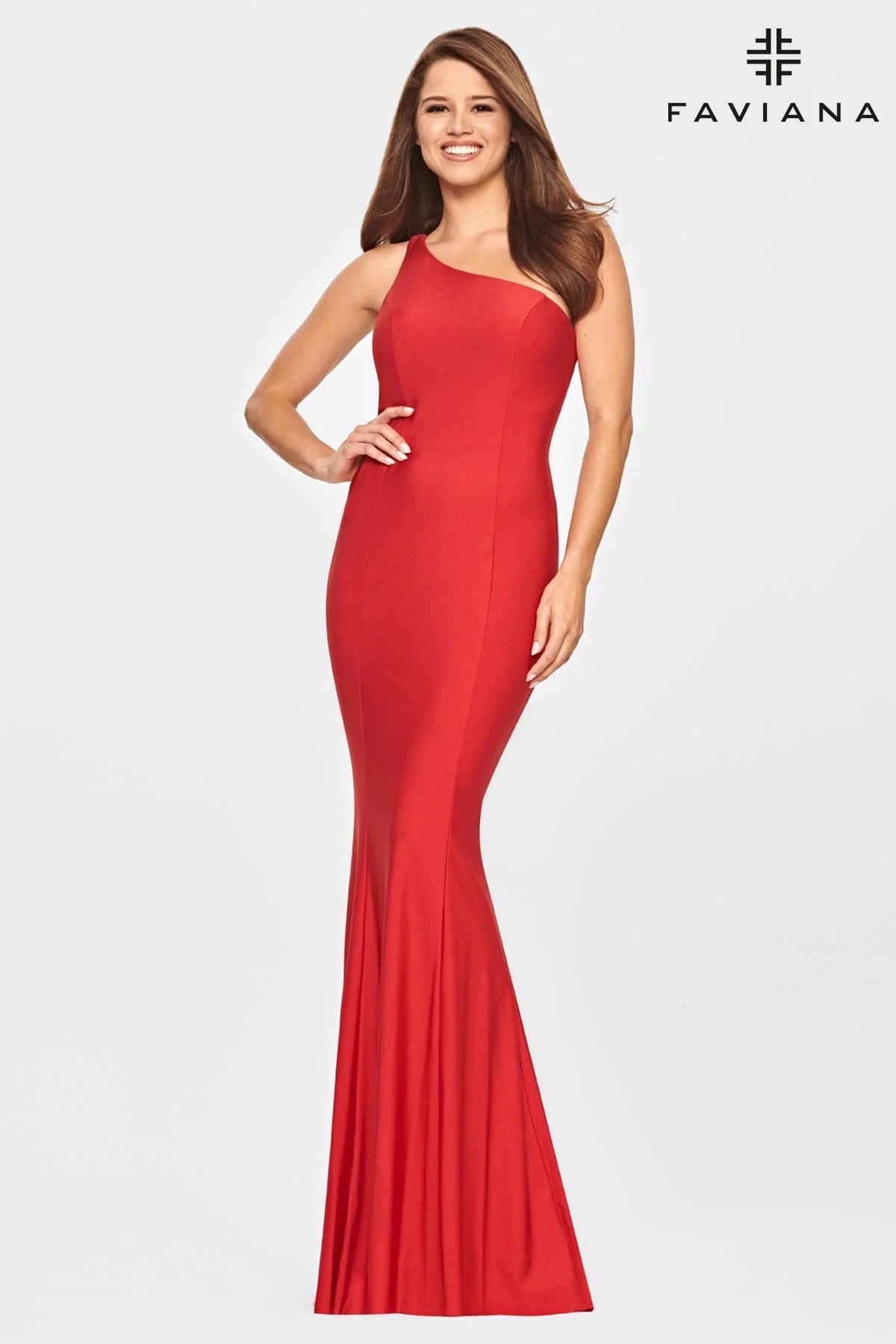 If you appreciate back details on a dress as much as we do, Faviana S10843 is the long style for you! A simple and elongating silhouette paired with a one-shoulder neckline is great on its own, but the three-strap open back and bum ruching is what really sets this dress apart. Get your hands on this style today!