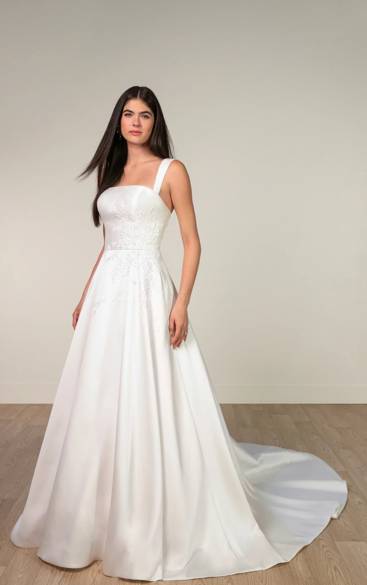 A-line, Mikado, gown featuring detachable straps, straight neckline, a bodice with boning for structure, delicate stitched floral patterns on the bodice that cascade around the back and down the skirt, scoop back, and buttons down the whole skirt.